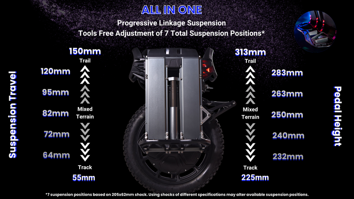 - Suspension: Fully adjustable DNM suspension (TRU 8RC or RCP 2S). Coil option available.