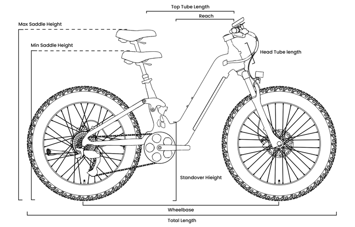 | Size | Reach | Top Tube | Standover | Wheelbase | Min Saddle | Max Saddle | Total Length | Head Tube |